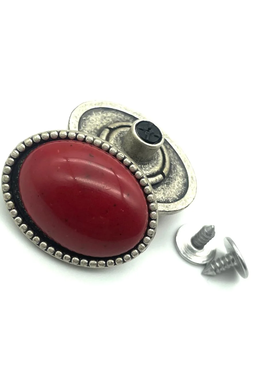 زر حبل أونيكس أحمر بيضاوي مع لمسة نهائية فضية قديمة